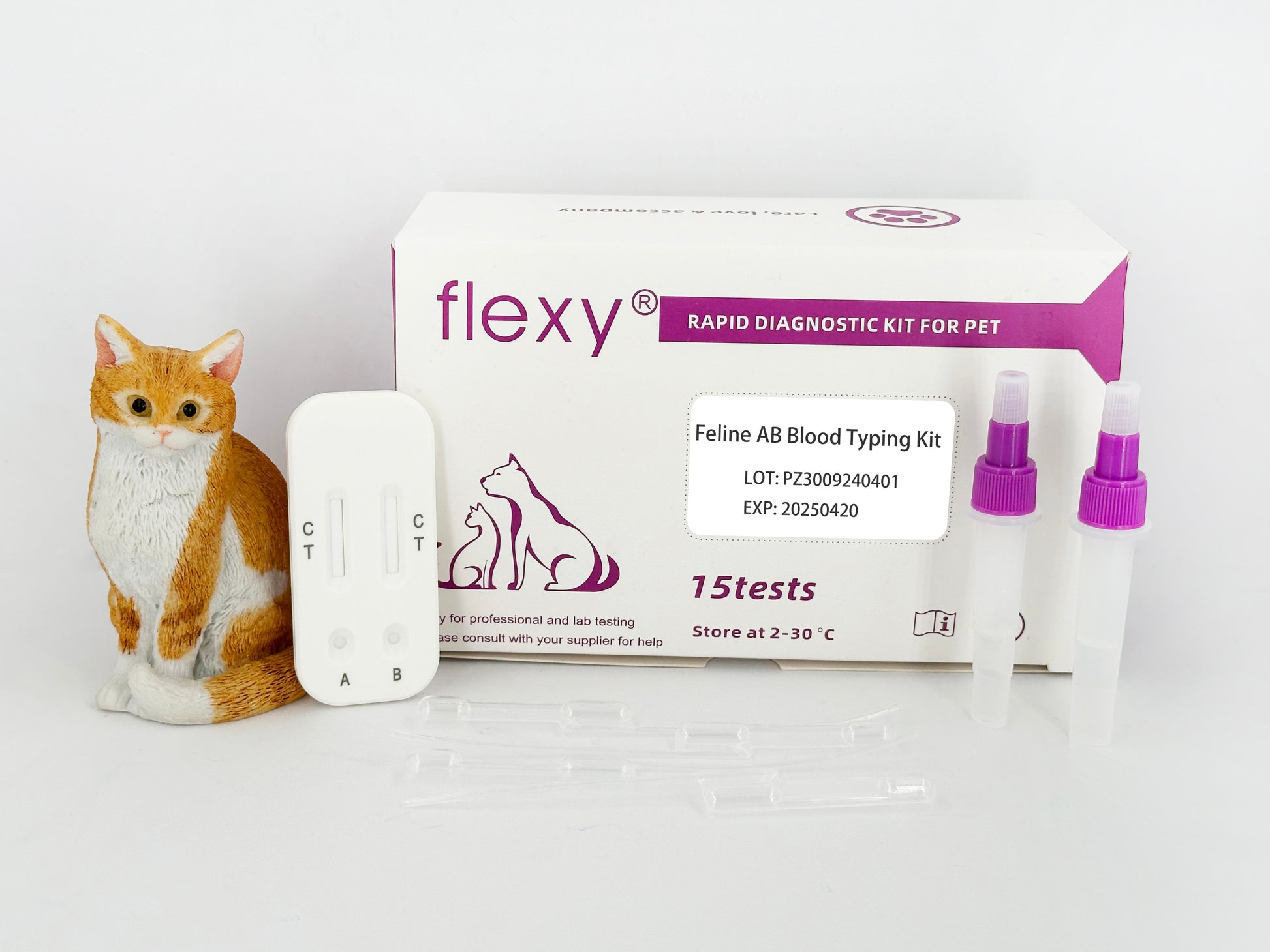 This Feline Blood Typing Kit is a 10min rapid test kit for cat blood typing, which can identify cat blood type A, B and AB. It is based on a rapid test technology.